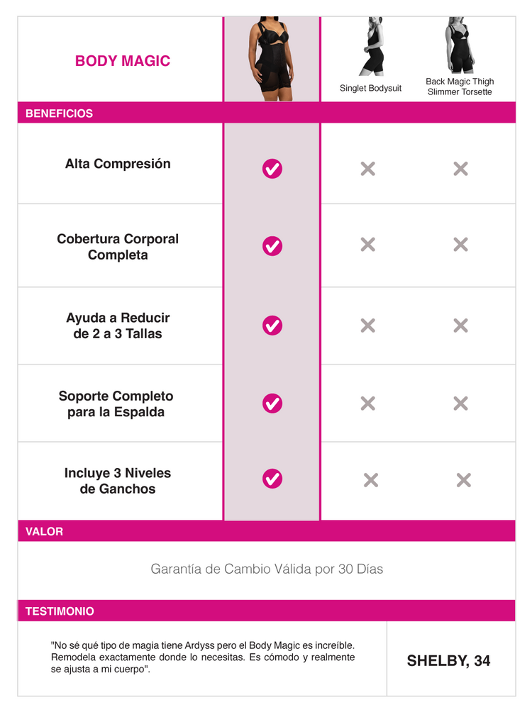 Nuestro Body Magic es una creación innovadora, que brinda al cuerpo una transformación ¡en cuestión de minutos! Esta prenda de revolucionario diseño otorga beneficios médicos y estéticos que ayudan a levantar el busto y a controlar los músculos del abdomen. Su inigualable mecanismo de "lipo-transportación", redistribuye el tejido adiposo y elimina la grasa de la entrepierna mejorando tu figura.